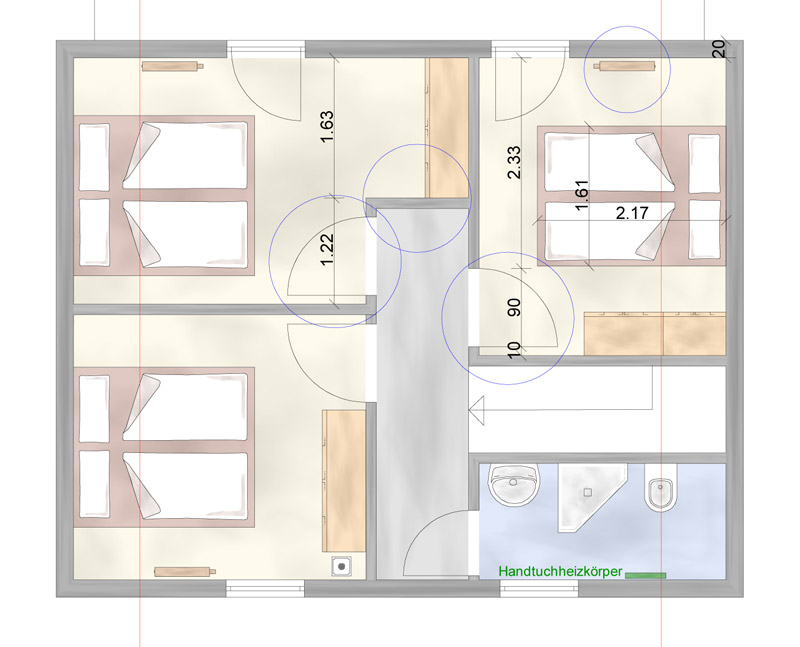 - 3 Schlafzimmer (2 x Doppelbett und 1 Schlafzimmer mit 2 Betten à 0,90 m x 2,00 m oder mit einem weiteren Doppelbett 1,80 x 2,00 m)